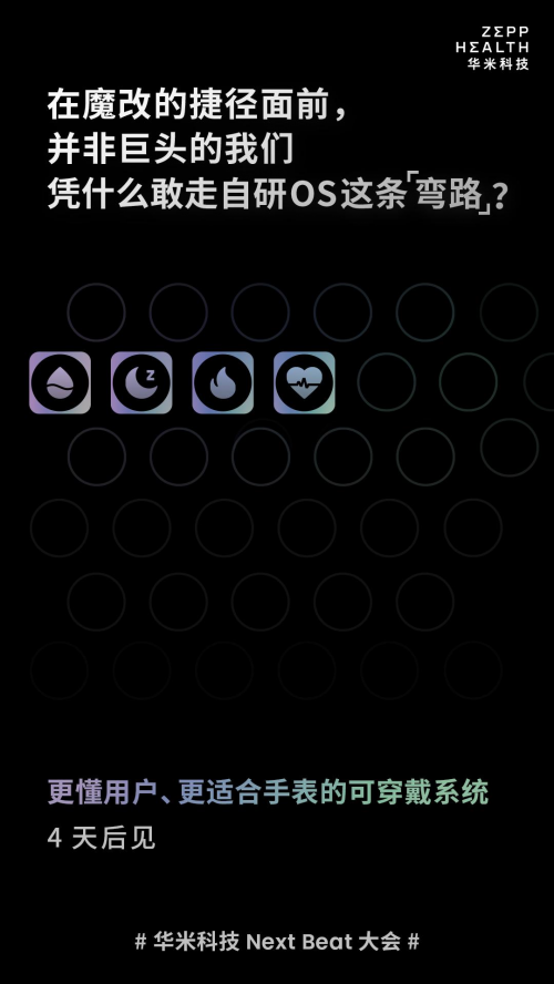 此前,華米科技宣布將于7月13日在合肥召開主題為“The Future of Health”的Next Beat 大會。今天,官方發布新的預熱海報,提出了“在魔改的捷徑面前,并非巨頭的我們憑什么敢走自研OS這條"彎路"?”的問題思考,正式宣布將發布一款更懂用戶、更適合手表的自研可穿戴系統。這是繼自研傳感器、芯片和健康算法后,華米科技在自研技術上又一次重大的突破。
