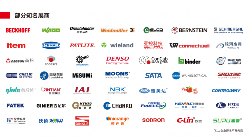 德國倍福、東方馬達、威瑯、米思米、萬可、魏德米勒、博恩斯坦、宜科、施邁茨、固安捷、科瑞、欣靈電氣、永宏、吉尼爾、長江電氣、電裝DENSO、怡合達、鳴志、雷賽、力控、速普電子、科捷、艾衛艾、椒星、沃德、町洋、慷博、杭州永創、科力爾、米博、NBK、NB、TBI MOTION、UBC、PBA、WON、仕達通、桃子、澤達、銳鍵、華成工控、圖靈、氣立可、日東、賽博、伙伴、嘉準、庫崎、優傲、青藍、紅獅、橙色云、電裝、IAI、雅馬哈、松靈機器人、增廣智能、長仁機器人、星精機械、維峰等知名企業也將帶來工業自動化軟件、智能控制系統、人機界面裝置、流體動力、工業通訊、機器人等領域的產品及應用解決方案。
