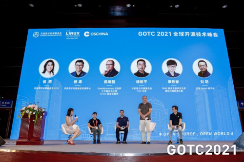 主論壇的最后一個環節,來自國內開源基金會的負責人 —— 開放原子開源基金會理事長楊濤、OpenHarmony 項目群工作委員會主席/ Linux 基金會董事侯培新、開放原子開源基金會 TOC 主席堵俊平、TARS 基金會董事會主席兼騰訊開源聯盟主席單致豪,在開放原子開源基金會 COO 侯燕女士的主持下,圍繞“開源與創新”展開了深刻的討論。