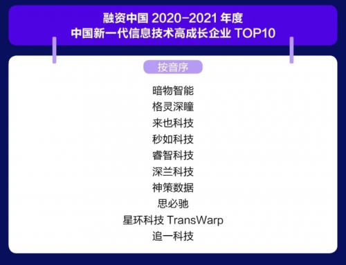 作為新一代的邊緣計算公司,秒如科技以專業的核心技術、優秀的研發團隊和長遠的未來發展贏得了融資中國評選團隊的認可,榮膺“2020-2021年度中國新一代信息技術高成長企業TOP10”的獎項。