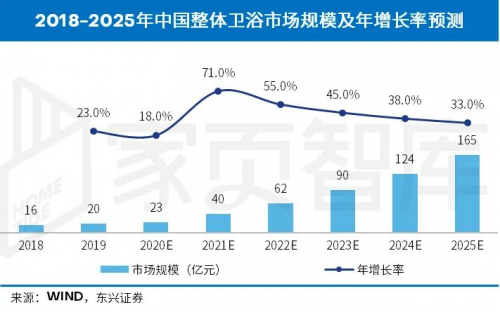 考慮到裝配式建筑推廣和整體衛浴滲透率的提升,預計2018-2025年整體衛浴主要應用市場(酒店/公寓/住宅)規模將從16億元擴張至165億元,復合年增速達到39.6%。