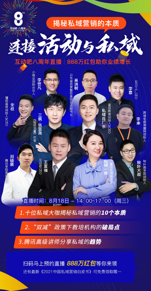 國內最大的活動發布平臺之一“互動吧”,將于2021年8月18日迎來成立8周年紀念日,屆時互動吧CEO王富強先生,將直播連線私域一姐、秋葉大叔、騰訊學院高級講師、私域肖廠長、《超級流量》作者三瘋等眾多大咖,共同帶來私域營銷本質、如何抓住私域流量紅利、探討“雙減”政策下教培機構的破局點等精彩內容。據悉,本次互動吧8周年直播峰會將于8月18日14:00在視頻號、抖音、快手等同步播出。