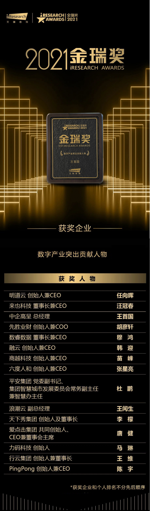 近日,由艾瑞咨詢主辦的第十四屆【2021 iResearch Awards金瑞獎】獲獎名單隆重揭曉,中企高呈總經(jīng)理王首國榮獲“數(shù)字產(chǎn)業(yè)突出貢獻人物”殊榮。