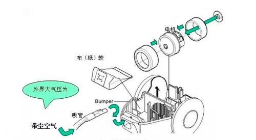 吸塵器的機體內安裝有專用的驅動電機和馬達,只要打開吸塵器的開關就可以運作了,通過馬達高速運轉,可以令周圍由葉片組成的葉輪高速轉動,使吸塵器內部產品瞬間的真空,進而和外部的大氣壓形成負壓差,在負壓差的影響之下,可以形成一定的真空吸附力,將吸嘴附近的灰塵和垃圾雜質等吸入塵盒中,以完成集塵工作,呈現良好的除塵效果。