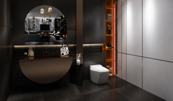 衛生間以深灰、白色為主,搭配金屬色、紅色加以點綴。