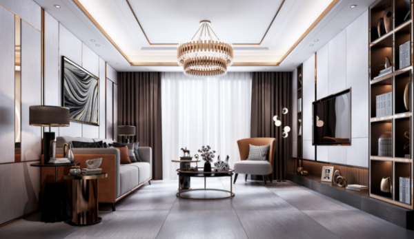 軟裝采用了強烈的對比配色,棕灰撞色的沙發質感滿滿,搭配金色的金屬茶幾、圓形吊燈,帶來典雅而又不失華美的家居情調。