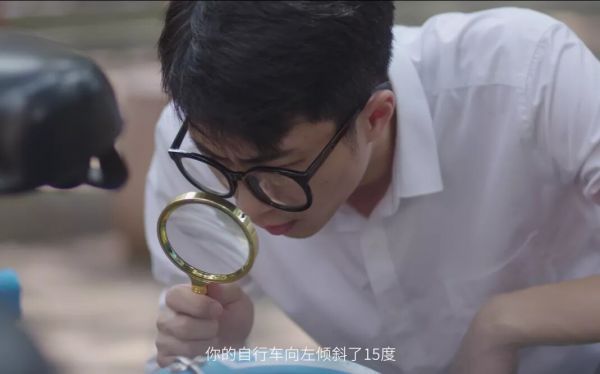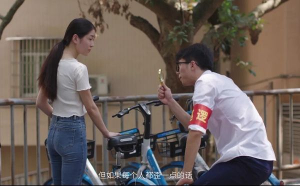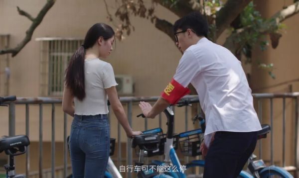 發現有人單車沒有停好,立刻跑上去查看,并表示:如果人人傾斜了15度,那整個停車區就亂了,很顯然小姐姐對他的小題大作很不屑,但男主仍然很耐心地幫她把車移正。