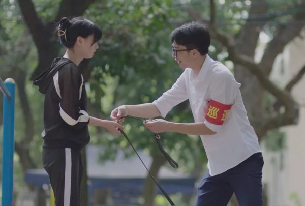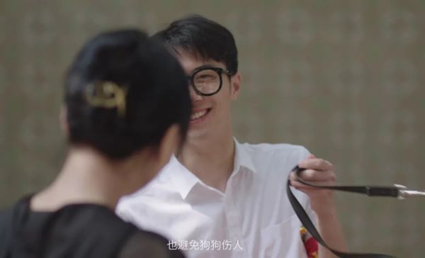 注意到有人遛狗沒拴狗繩,男主急忙走過去規勸,狗主人聽完非常不耐煩,但男主依然貼心地幫忙把狗繩系好,并遞到狗主人手中。