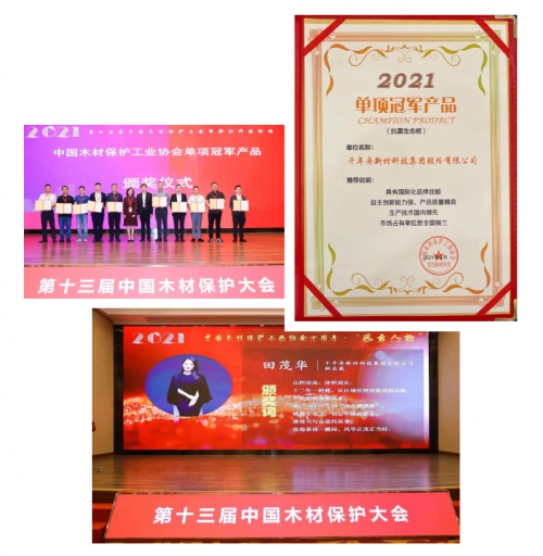 本次大會公布了中國木材保護工業協會十周年風云人物獎及單項冠軍產品獎。其中,千年舟集團副總裁田茂華榮獲中國木材保護工業協會十周年風云人物獎;千年舟旗下「抗菌生態板」斬獲單項冠軍產品