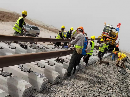 中鐵一局新運公司承擔著全線215孔T梁制架、114.6公里正線鋪軌、40組道岔鋪設以及線路上砟整道等施工任務。為高質量推進施工生產進度,項目部將原計劃邊鋪邊架的機械架梁方案改為更為靈活的汽車吊架梁,投入各類吊車13臺,截止目前已完成T梁架設197孔,期間創造了日架梁5孔的好成績。