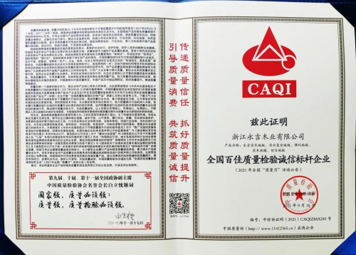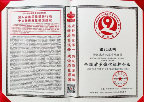在近日的全國“質量月”活動期間,永吉地板憑借過硬的產品質量與誠信經營的企業理念,榮獲“全國百佳質量檢驗誠信標桿企業、全國質量誠信標桿企業”榮譽,用質量和誠信鑒證企業實力!