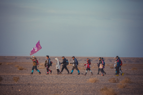 戈壁徒步,越往后越艱難,但人生沒有白走的路,每一步的磨礪、迷茫都有價值。有的人雙腳布滿水泡,依然一瘸一拐的挨到終點;有的人明明心里想著要放棄,但是腳步絲毫沒有減慢半分;隊長拽著體力稍弱的隊員往前趕;實在走不動了,團隊抬著走也決不放棄。