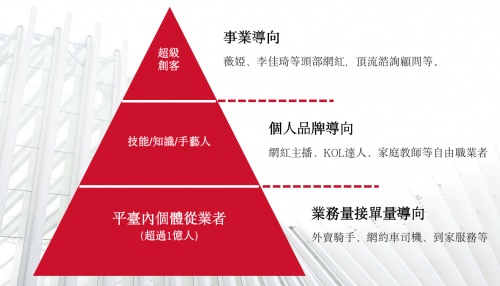 根據人社部數據,2020年我國靈活就業從業人員規模約2億人,成為吸納就業的“蓄水池”。劉樹兵創新性地把國內2億多靈活就業者群體形象地劃分成一個“金字塔”,歸納了目前靈活就業群體的分類畫像:處于頂端的是事業導向型的超級創客,如現在的頭部網紅主播,及頂流咨詢顧問等;腰部則是擁有某項技能和特長的自由職業者,如手藝人、家庭教師等;處于金字塔基座,是人數最多的“平臺內個體從業者”,以業務接單量為導向的外賣騎手、網約車司機等,也是薪寶科技聚焦的對象。