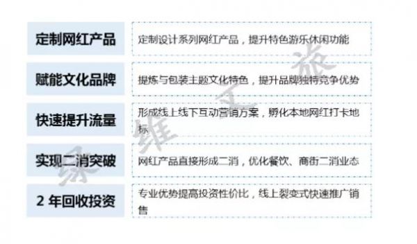 核心特色:無需建設用地,網紅化品牌包裝,投資500萬,3個月落地,2年實現營收。