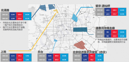 縱觀北京商辦市場三個季度以來的表現,新興商圈憑借辦公環境優越、租金價格較低、區域繁華指數日益上升等優勢,對企業產生了很強的吸引力。北京經開區是北京市唯一同時享受國家級經濟技術開發區和國家高新技術產業園區雙重優惠政策的國家級經濟技術開發區,也是相較于傳統商圈的北京新興商圈之一。過去一年里,“三城一區”、“兩區”建設的利好進一步惠及到經開區,2021年上半年四大主導產業完成工業總產值2650.5億元,同比增長40.2%,新一代信息技術、高端汽車和新能源智能汽車、生物技術和大健康、機器人和智能制造產業等高精尖產業集群加速形成;新增市級以上研發機構11家,簽約項目183個。