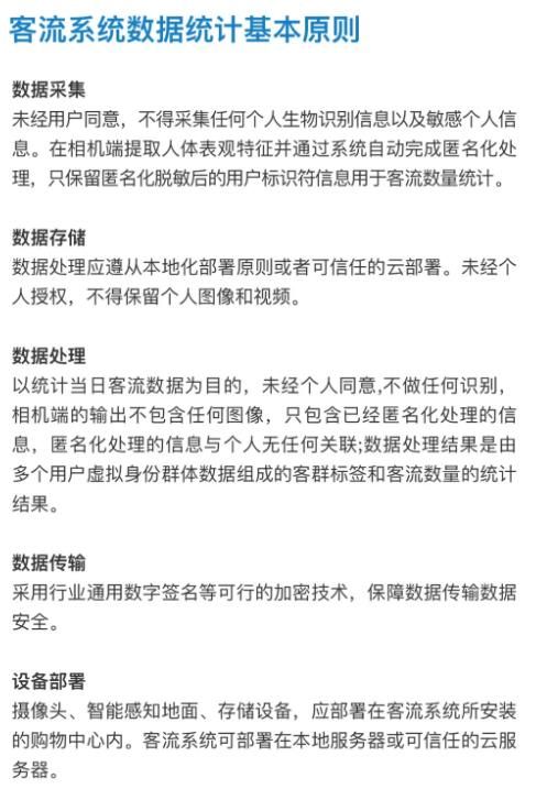 具體實施上,《購物中心客流系統數據統計規范》要求未經用戶同意,不得采集任何個人生物識別特征信息以及敏感個人信息。在相機端提取人體表觀特征并通過系統自動完成匿名化處理,只保留匿名化脫敏后的用戶標識符信息用于客流數量統計。在數據存儲上,應遵從本地化部署原則或者可信任的云部署。未經個人授權,不得保留個人圖像和視頻。在數據處理上,以統計當日客流數據為目的,未經個人同意,相機端的輸出不包含任何圖像,只包含已經匿名化處理的信息,匿名化處理的信息與個人無任何關聯;數據處理結果是由多個用戶虛擬身份群體數據組成的客群標簽和客流數量的統計結果。在數據傳輸上,采用行業通用數字簽名等可行的加密技術,保障數據傳輸數據安全。