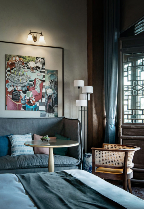 作為文旅項目的精品民宿,坐落于繁華的清代京城景區,民俗“入世”的戲曲文化做為空間主題,和被市場過度“出世”描述的民宿客棧結合,注定“西廂”的設計不應當和古老純粹的中式街區過度表里如一。我們早已習慣的“宋”式審美,清減干凈,禪意孤清,也不是清末京劇盛行時的時代語境。“西廂”客棧在保證了舒適和品質的體驗之外,應該有一種撞入眼簾的驚喜,有足夠的戲劇沖突,來支撐整個項目的主題。
