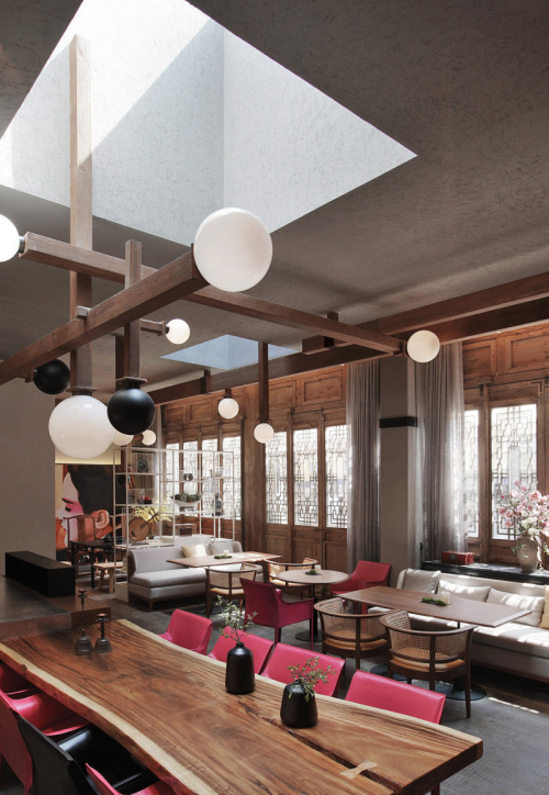 京劇藝術融匯于清中晚,盛于民初,近代西方的殖民化色彩、新民主思潮、東方封建傳統,都在這個時期碰撞、交融并五彩斑斕。在古老的清代建筑里,制造新與舊、結構與裝飾、東西方文化沖突。用碎片的、解構的方式來回應那個時代和詮釋戲劇沖突的主題,不是形式化具體的一個個只供瞻仰的戲曲元素,而是把印象分解重構,形成邏輯的關聯,重塑事物的印象,讓過去和現在對話,重組一個適合當下的住宿空間。以“附生”的方式,用“盒子”構成,把新的功能和組織嵌入古建結構中,裝飾依托功能,被裝置式的置入,營造“共生”關系,而不是拆移式的“重塑”。傳統的斗拱結構,結合寓意京劇鳳冠上的云珠及劇院后臺化妝燈的燈具,形成串聯所有不同空間的裝飾線索,并成為空間結構的一部分。戲曲的場景、人物、色彩被抽象化,運用到家具、陳設、燈具、導視系統之中。塑造一個“曖昧”,而主題不具體具象的空間,一如案名《西廂和中國傳統曲目《西廂記》的多重解讀。