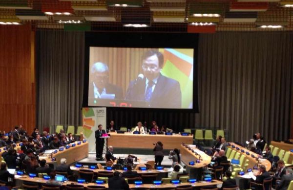 當(dāng)?shù)貢r間2014年9月23日,巴黎氣候變化大會前最為重要的大會——2014年聯(lián)合國氣候峰會在紐約聯(lián)合國總部隆重舉行,來自全球120多個國家的元首和政府首腦齊聚一堂,共同商討全球氣候變化問題。應(yīng)時任聯(lián)合國秘書長潘基文邀請,比亞迪股份有限公司董事長兼總裁王傳福作為全球唯一被邀請的汽車企業(yè)代表,出席峰會并發(fā)表演講。王傳福指出,城市公交電動化是快速提升城市空氣質(zhì)量的最佳途徑,全球?qū)⒂瓉沓鞘泄浑妱踊慕煌ǜ锩希鮽鞲:粲醺鲊鴮㈦妱悠囈氲礁鼜V泛的城市交通領(lǐng)域,并預(yù)測:不久的將來,光伏發(fā)電及新能源汽車將會成為世界各國的重中之重。
