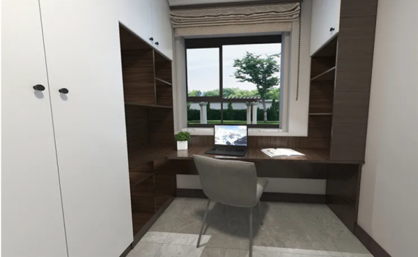 書房與鋼琴間進行了一體化設計,居住者無論是工作、學習還是練琴,都可以享有更安靜和私密的空間。書房中的書柜也設計為封閉與開放相結合的方式,美觀的同時,也有利于物品、書籍的收納和取用。