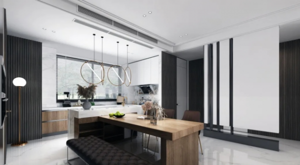 餐廳是一個充滿煙火味的空間,家人每天都在這里享受美食,裝修時選用簡潔的色調(diào)+精良的材質(zhì),可以帶來溫馨和諧、優(yōu)雅時尚的空間感。