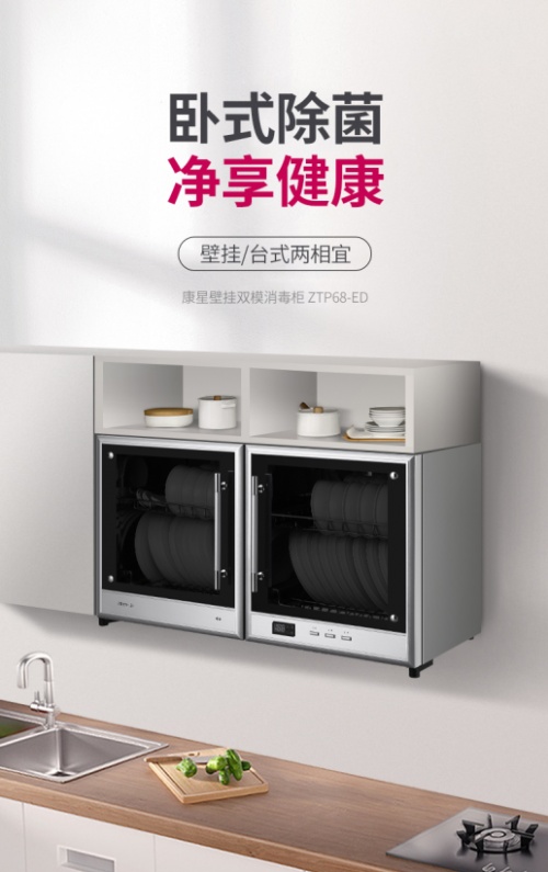 新的一年連消毒柜都不躺平了,你還選擇躺平嗎?康星ZTP68-ED壁掛雙模消毒柜,讓消毒柜不僅能躺平,還能掛起來。幼兒園壁掛式、家居廚房壁掛式、家居廚房臺式3種消毒柜安置方式,讓你隨心選擇更省空間。二星消毒,125℃高溫消毒,讓頑固性病菌及細菌無處可藏。