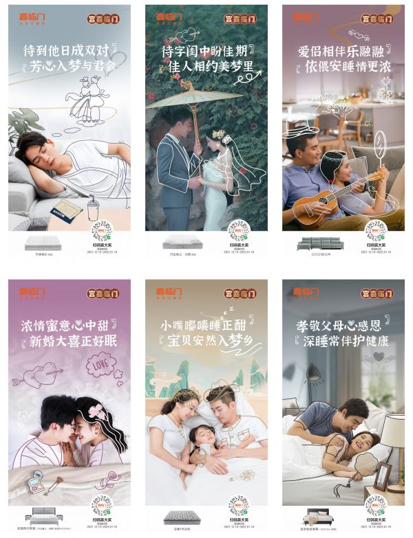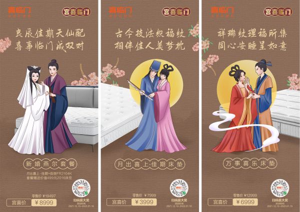 按照常理來(lái)說(shuō),床墊品牌的春節(jié)營(yíng)銷(xiāo)莫過(guò)于“打折促銷(xiāo)、滿(mǎn)減活動(dòng)”等套路,這并不能引起于消費(fèi)者的購(gòu)買(mǎi)欲。想要更好的吸引消費(fèi)者關(guān)注,就要讓營(yíng)銷(xiāo)“生動(dòng)”起來(lái),讓大家對(duì)宮喜臨門(mén)有形象直觀的認(rèn)識(shí)。對(duì)此,喜臨門(mén)的做法是從人群定位入手,打造出“不同階段人群”、“古代CP”、“前世今生客群”三組強(qiáng)視覺(jué)性人物海報(bào),充分與人物群體聯(lián)系起來(lái),讓其成為宮喜文化IP活動(dòng)的“代言人”。