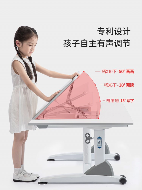 大將作面板可調節角度為0°-45°,共12個檔位,同時滿足孩子在面對讀寫繪畫等不同情況下的使用需求。一體成型收納大抽屜、隱藏式閱讀書檔保證了使用空間足夠大,桌面極簡設計也可以幫助孩子培養專注力。配套的人體工學椅,可支撐人體背部曲線,保護脊椎,舒緩疲勞,釋放腿部壓力,養成正確坐姿好習慣。