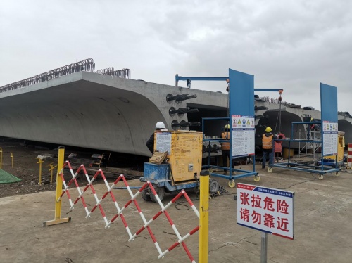 “在鋼筋加工車間,技術人員僅需將圖紙信息以計算機語言的形式輸入智能鋼筋加工系統,就能高效率、高精度的加工出所需的各種規格鋼筋;而在梁體養護方面,系統可根據濕度、溫度變化調節噴水養護的時間,整個養護過程自動循環,用水量比傳統養護節約近50%;另外在預應力張拉和靜載試驗方面,智能化和信息化設備的使用,不僅保障了箱梁預制質量和進度,還減少20人的人工成本。”梁場負責人逄鄧軍介紹到。