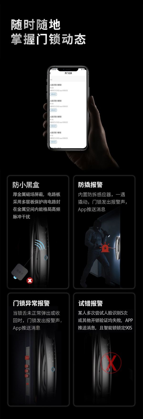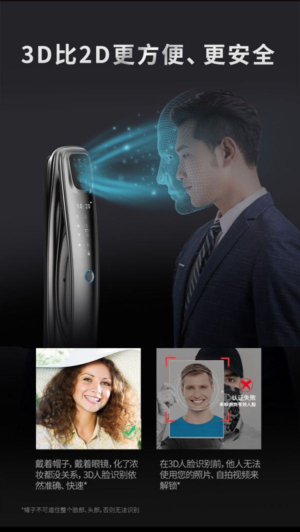 鎖具在安裝以后,需要使用者錄入自己的面部和指紋信息。每個人的指紋和面容各不相同,除了使用者本人以外,其他人能打開鎖具的幾率幾乎為0。特別適合家里有小孩或者獨居的朋友使用。