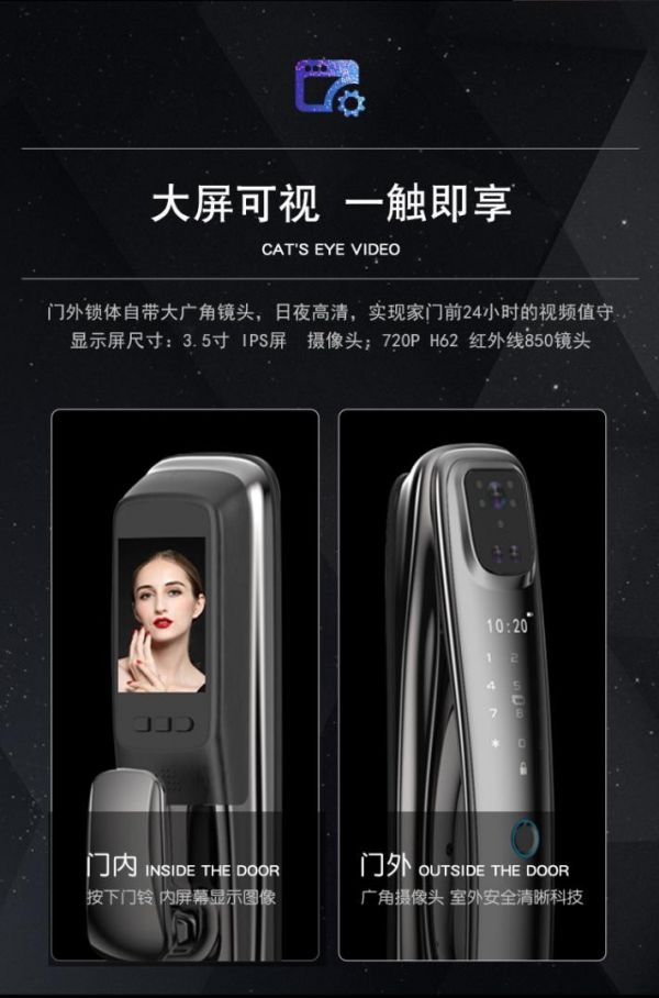 1.祥云系列的智能鎖搭載了高清的攝像和顯示屏幕,使用者在家里就可以將外面的一切看的一清二楚。想要從外面打開房門的話,不需要再去掏鑰匙,只需要把自己的面部對著攝像頭掃描,智能系統會自動分辨面部特征,并且和自己系統中的面部識別庫匹配,開鎖只需要一秒鐘。