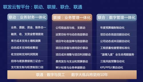 聯(lián)動(dòng):財(cái)務(wù)與業(yè)務(wù)融合,數(shù)據(jù)上得來(lái)。通過(guò)數(shù)字化平臺(tái),做到財(cái)務(wù)四流合一,財(cái)務(wù)前置業(yè)務(wù)管理,以及稅賦平衡,實(shí)現(xiàn)整個(gè)集團(tuán)、區(qū)域、各專(zhuān)業(yè)線(xiàn)的數(shù)據(jù)同一口徑,同一張報(bào)表。
