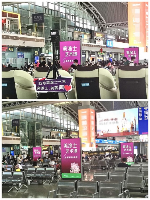 在擁擠又喜悅的五一出游路上,旅客在高鐵站內抬頭就能見到美涂士藝術漆廣告畫面,“綠地紫花”的視覺效果,“美涂士藝術漆 從底到面抗甲醛”的醒目字樣,以及熟悉的品牌印象,成為高鐵站里一道亮麗的風景線!